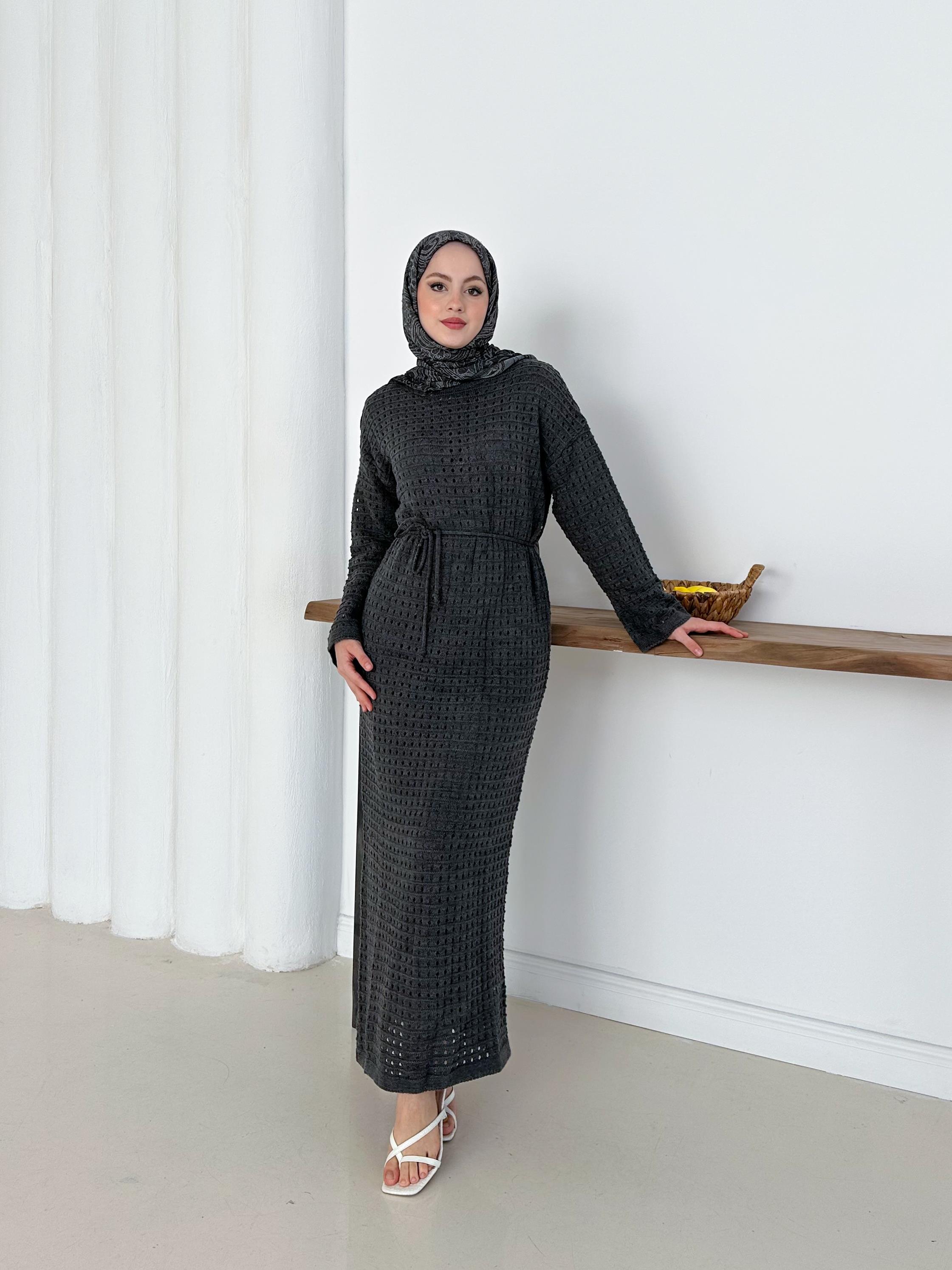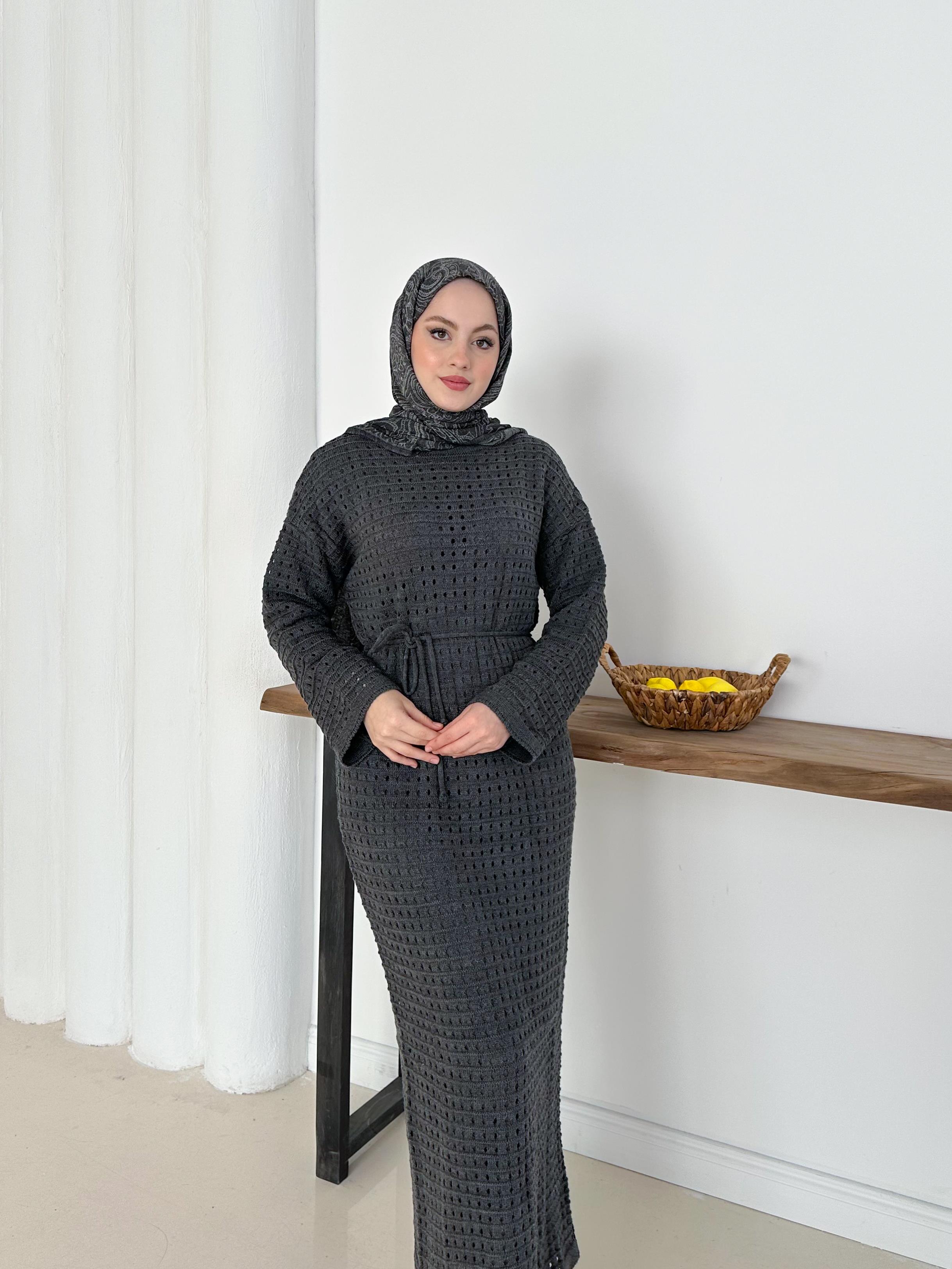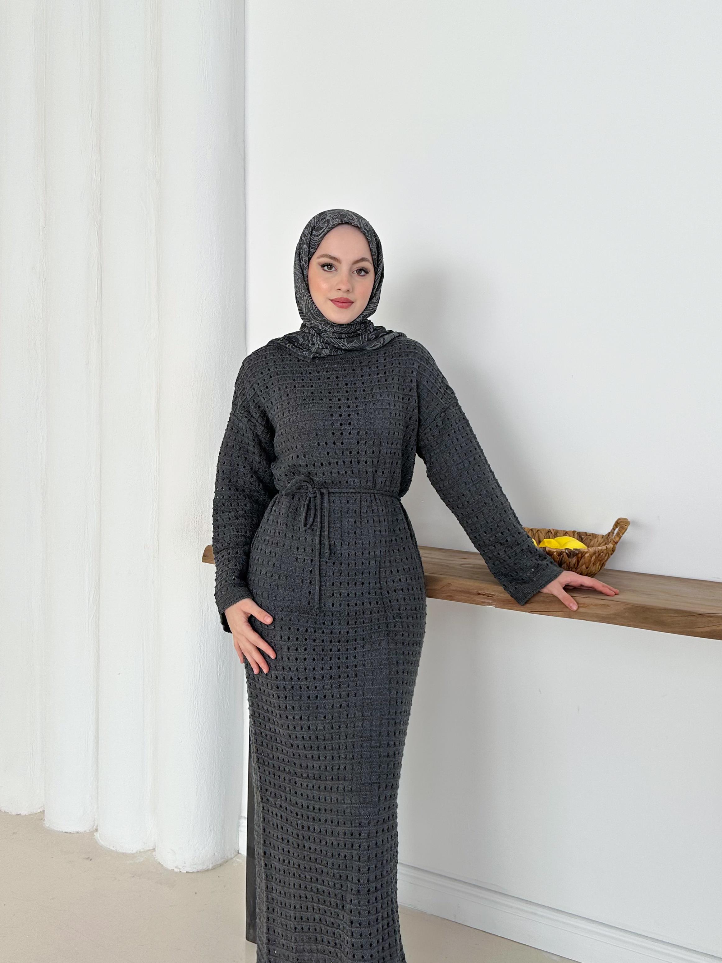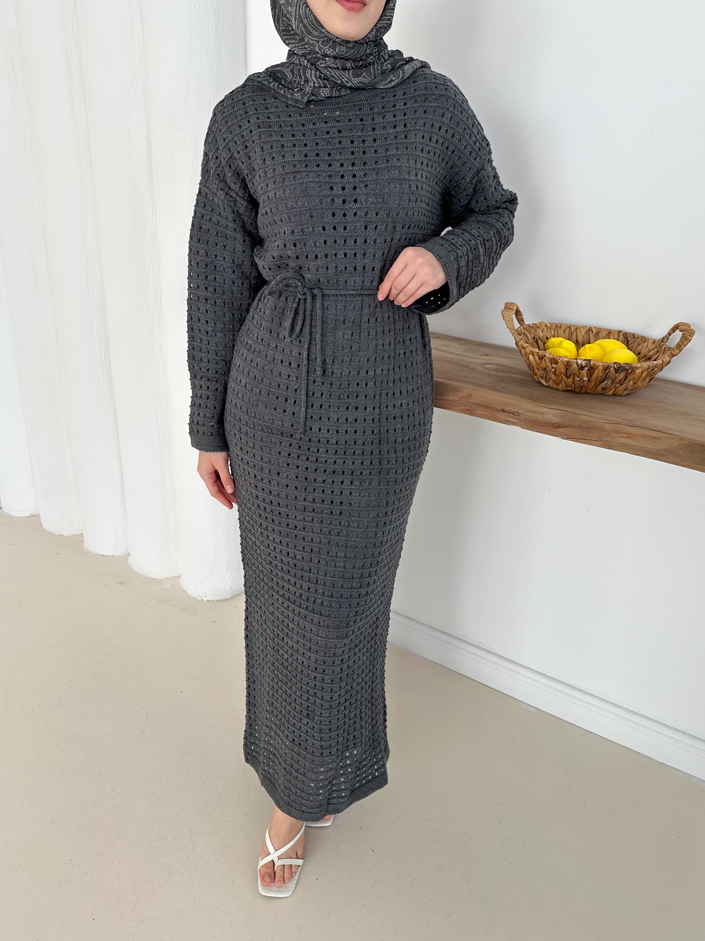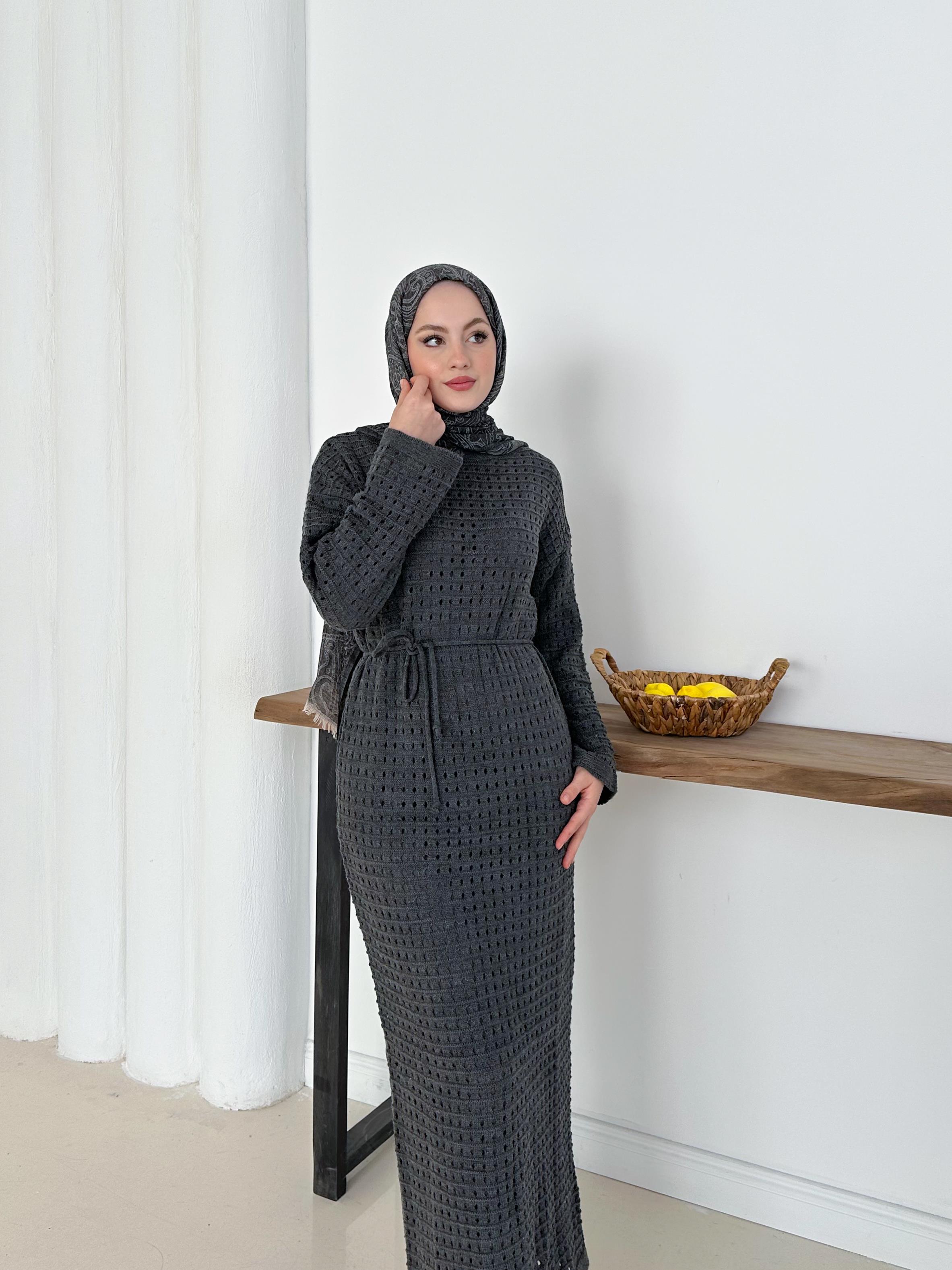 Desenli Gri Triko Midi Elbise (Astar Içlikli)