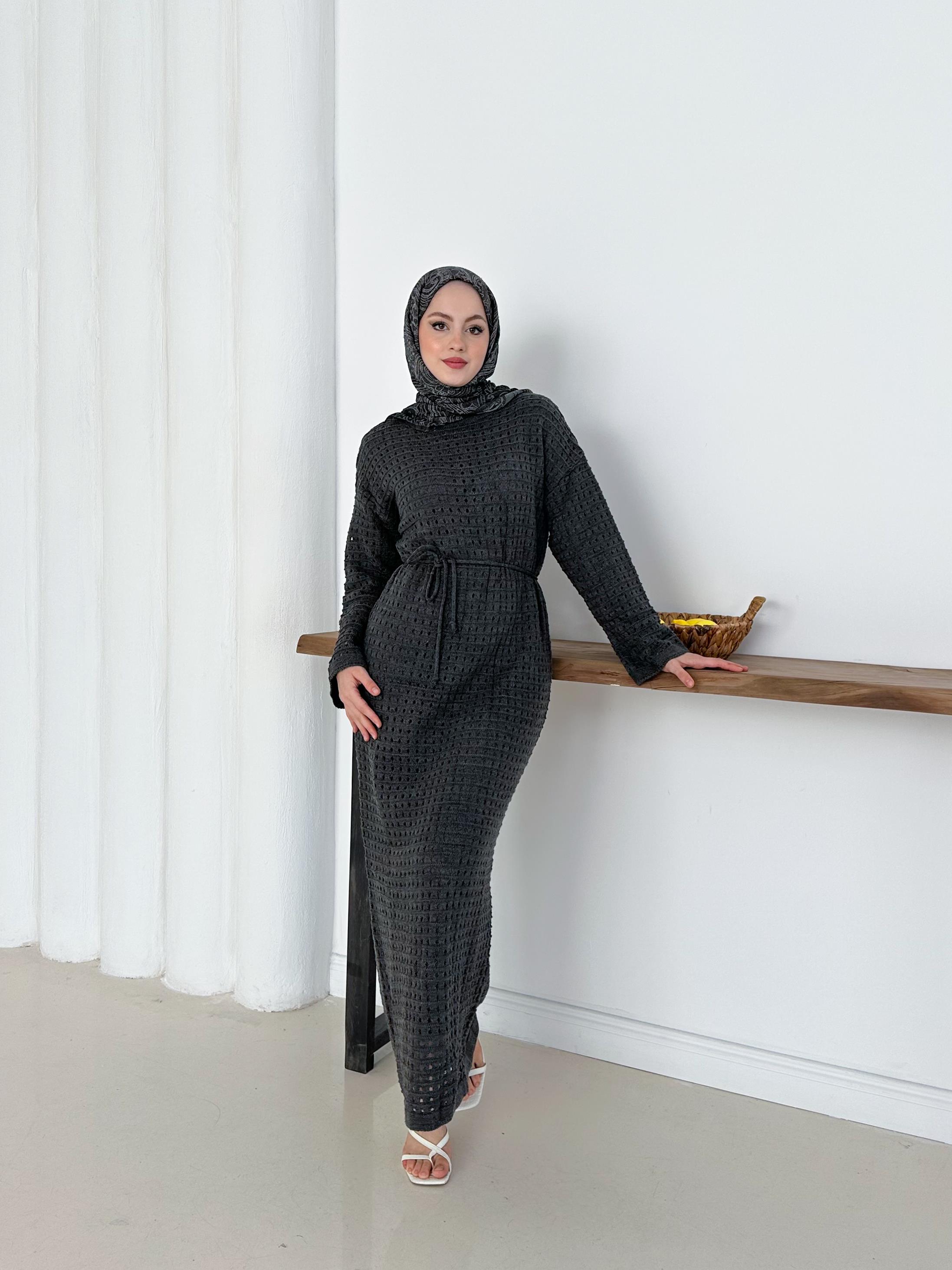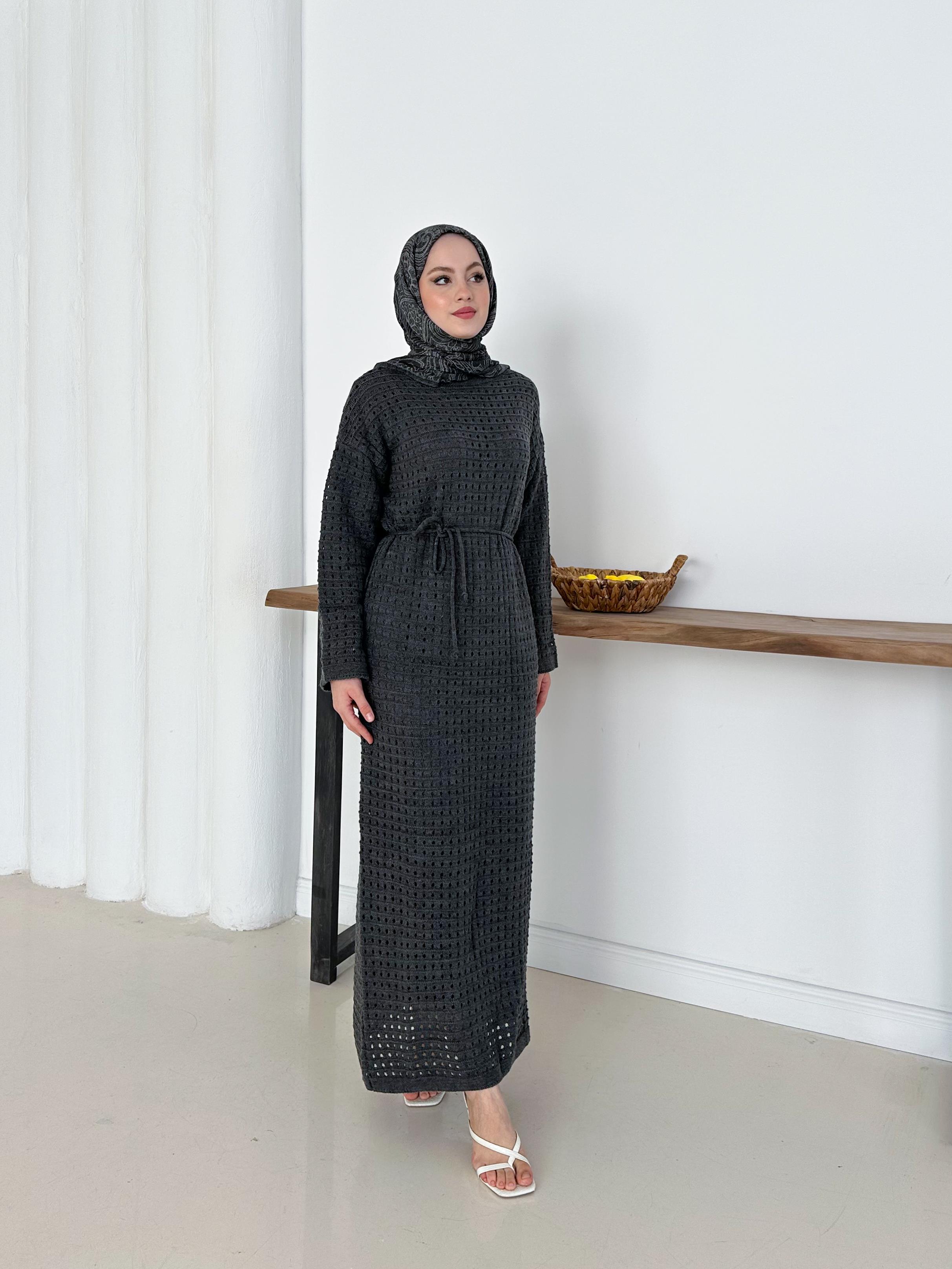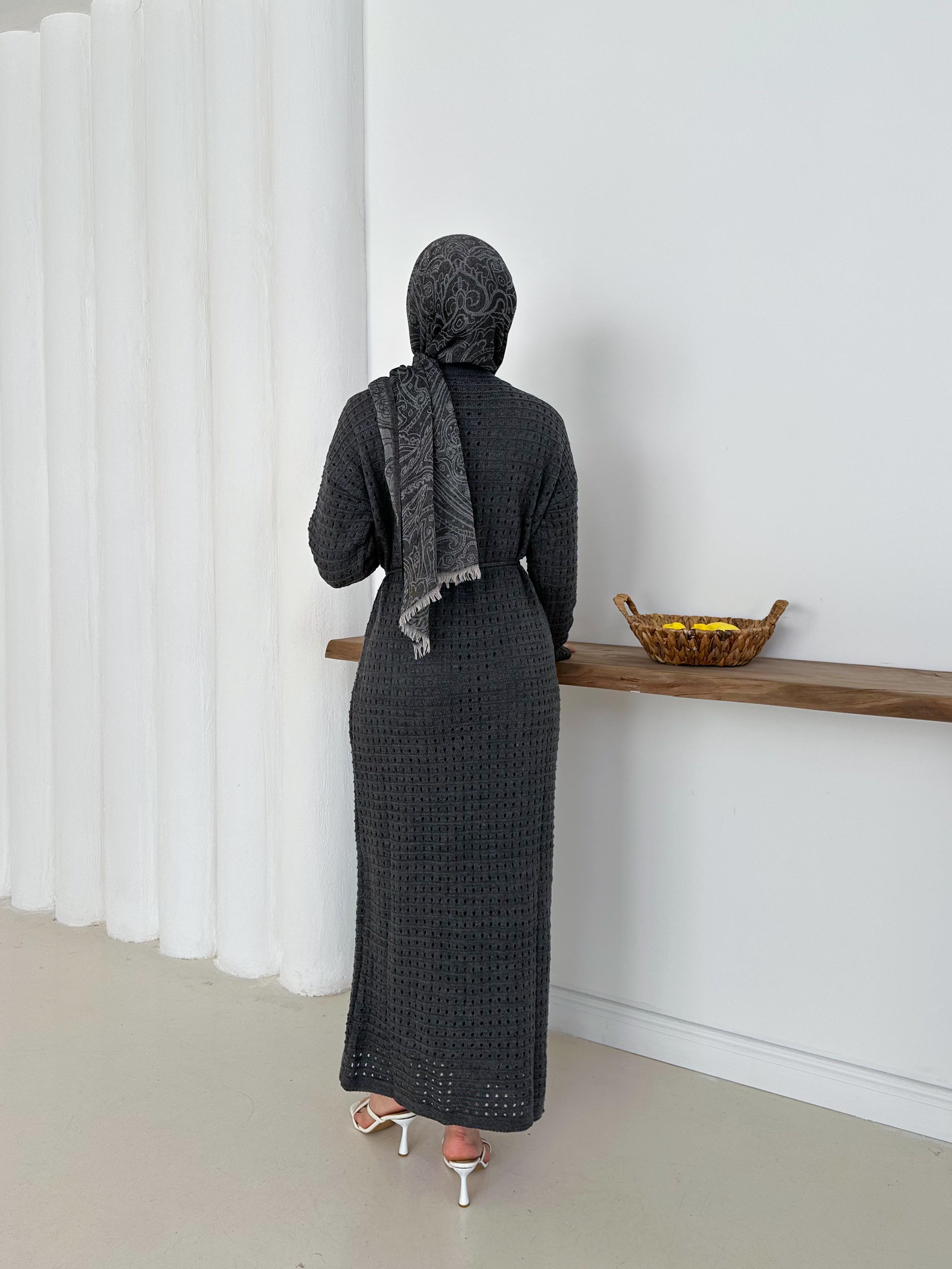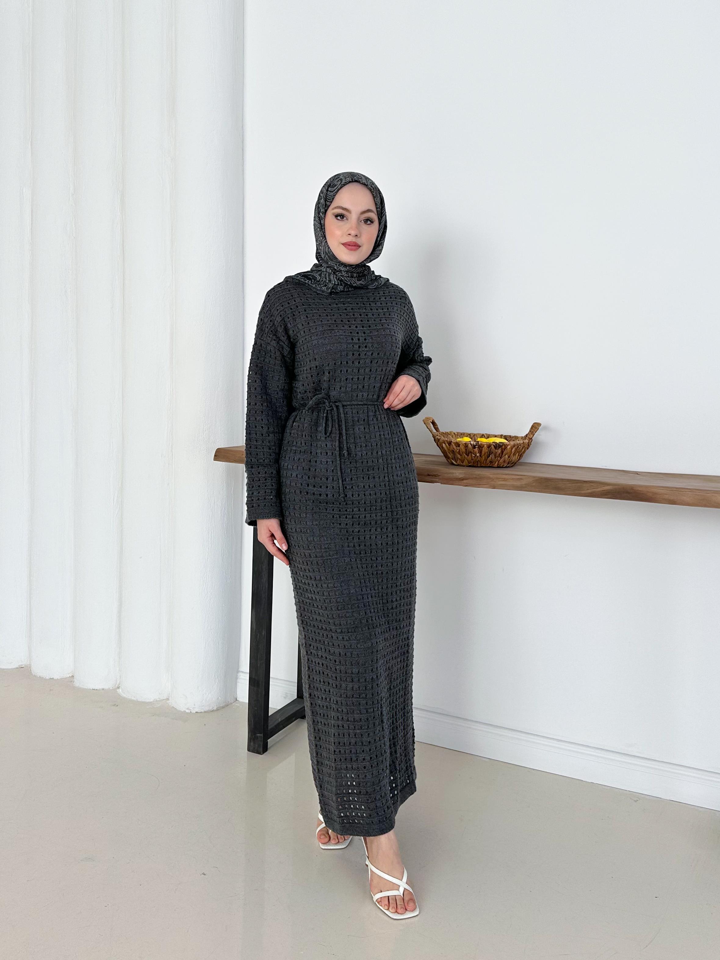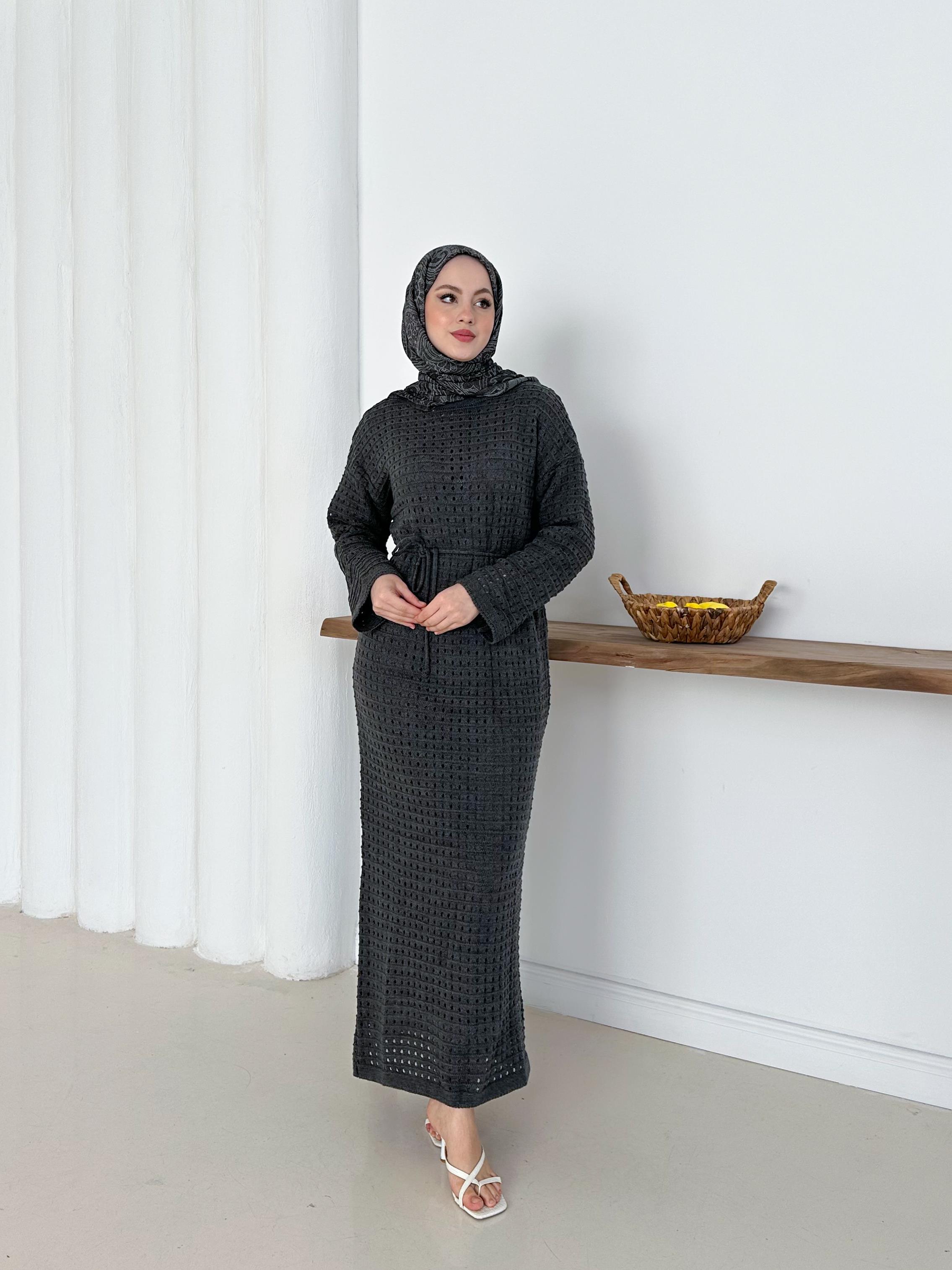 Desenli Gri Triko Midi Elbise (Astar Içlikli)